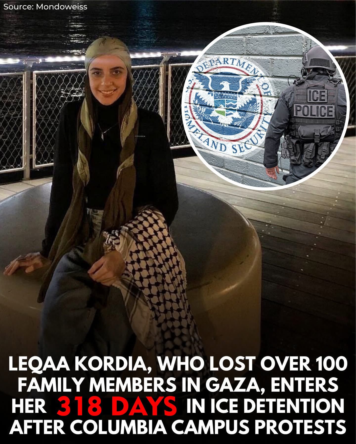 Repelita New York - Leqaa Kordia, seorang aktivis Palestina berusia tiga puluh tiga tahun, masih mendekam dalam tahanan otoritas imigrasi Amerika Serikat.